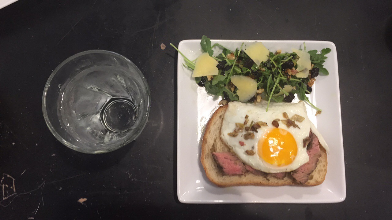 *Food: Rosemary and thyme sous vide steak with eggs over sourdough, caramelized onions, garlic, and an arugula salad with dried cherries, mustard seed and white cheddar. I did the beer cooler method, and it worked marvelously. I love cheap, easy methods.